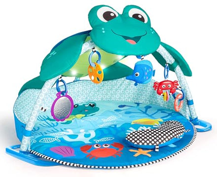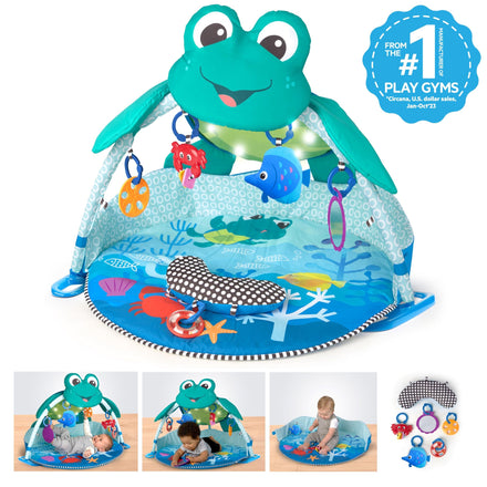 Details: Ocean floor exploration and play await your little one with this infant play gym with lights and melodies. With the Baby Einstein™ Neptune Under the Sea Lights & Sounds™ Activity Gym, babies can experience 20+ minutes of a gentle lights and melodies from around the world that help them stay engaged and curious. Neptune’s belly forms a 360-degree canopy dotted with glowing lights and surrounding interactive hanging toys that stimulate eye tracking and neck muscle development. Detach the plush fish, ring rattle, shell mirror, crab bead chaser, or sand dollar teether to keep baby occupied in the car, the carrier, or stroller. The prop pillow allows your little one to exercise growing muscles during tummy time, and hanging toys attach to the pillow’s fabric loops for extra tummy-time teething, rattling, and playing. This activity mat allows babies to explore in a secure space so that you can enjoy hands-free moments while watching your little one make new discoveries about the underwater world.
