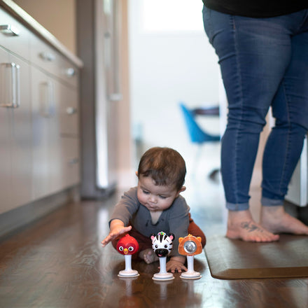 Details: Add more jingles to mealtime, road trips or Stay-in-Place playtime with the rattle & jingle trio from Baby Einstein. With suction cup feet, These music shaker Pals stick to flat surfaces like tables and high chair trays. Each friendly face makes a different sound to keep your little one entertained. With transparent backs, your baby will love concentrating on the noisemaker tucked inside. Introduce cause and effect fun with a table toy that's easy to grab and go!