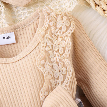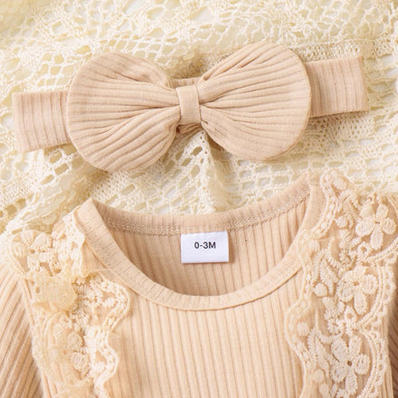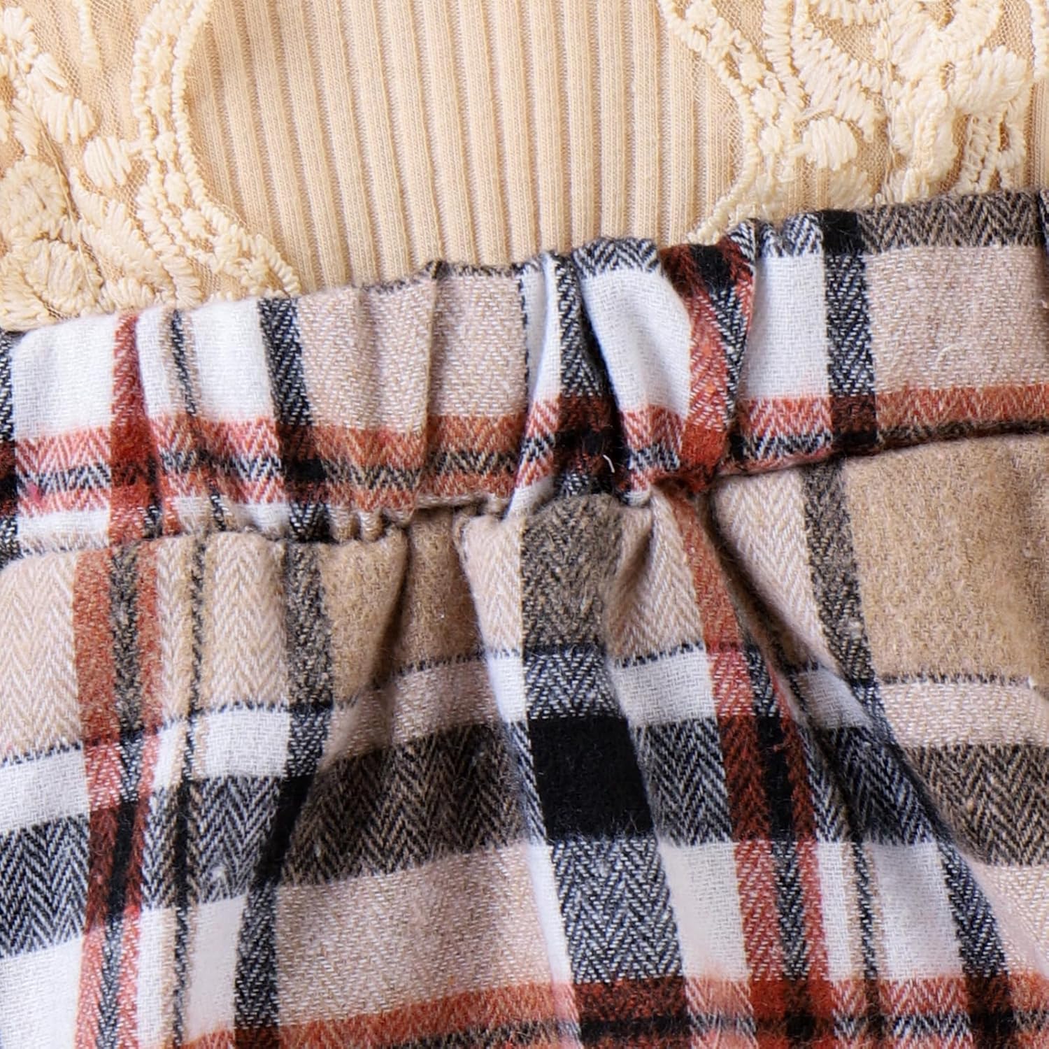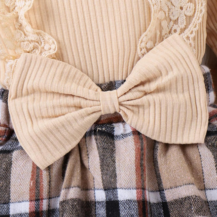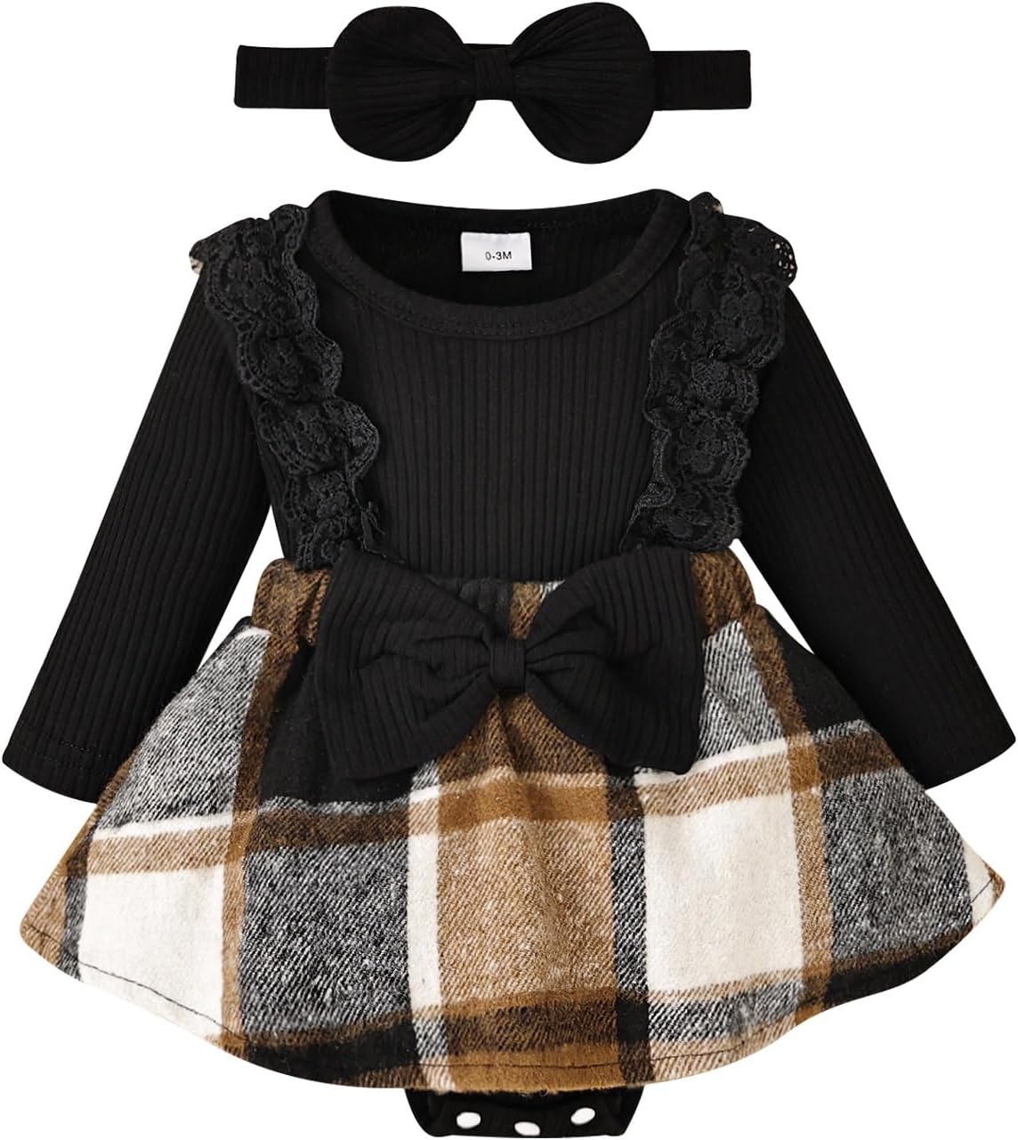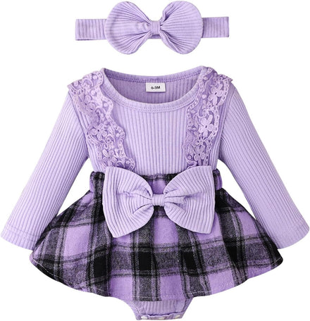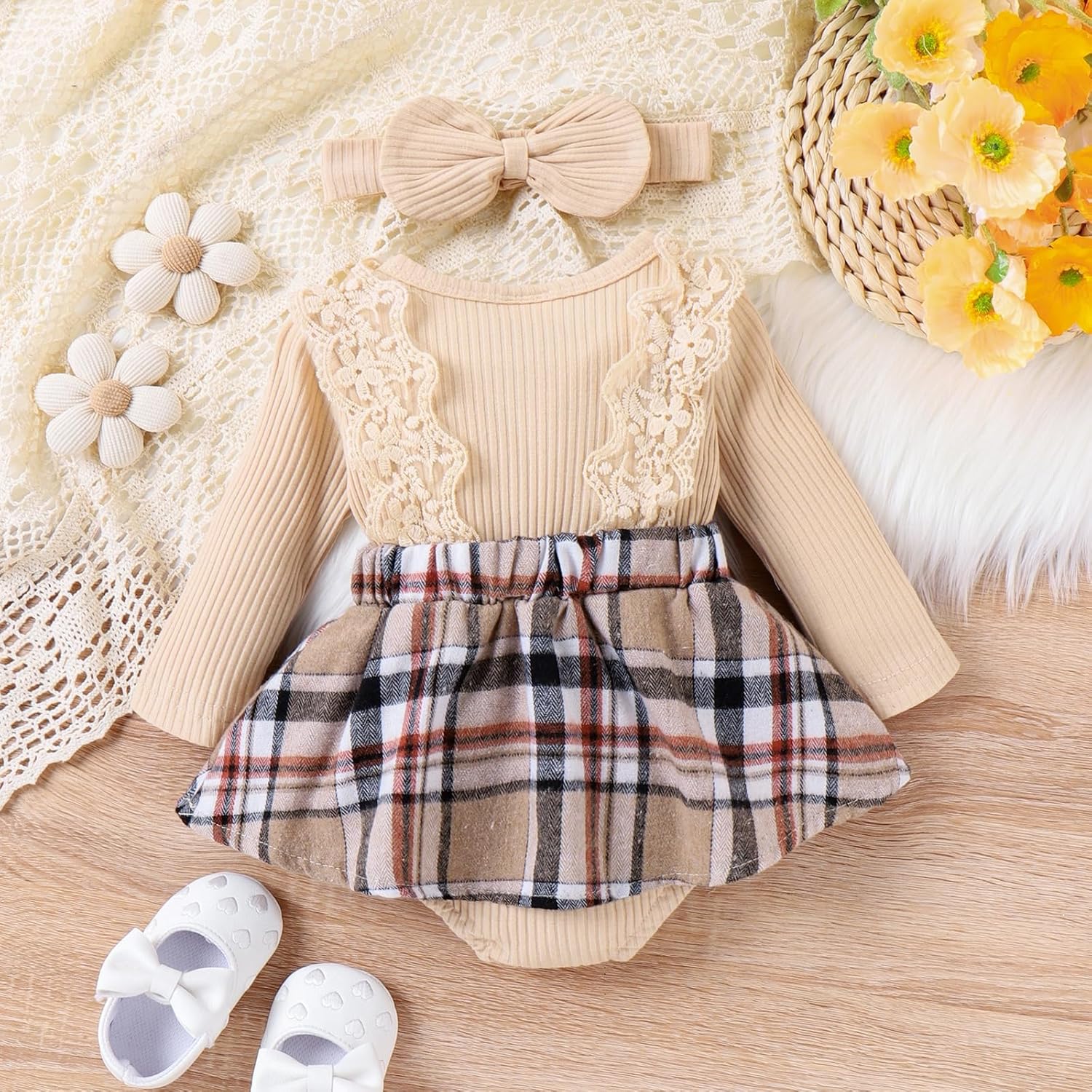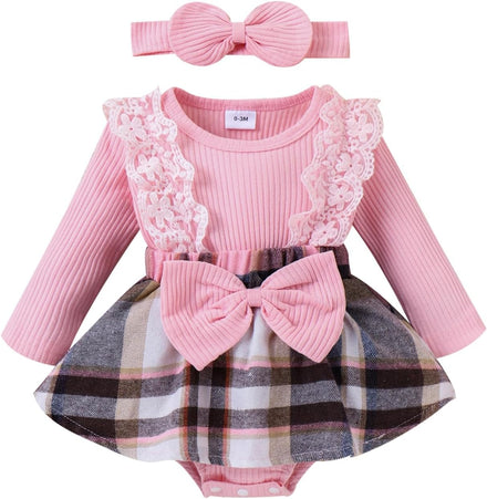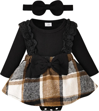 Baby Girl Clothes Fall Winter Outfit Plaid Romper Long Sleeve Dress Lace Ruffles Bodysuit with Bow Headband