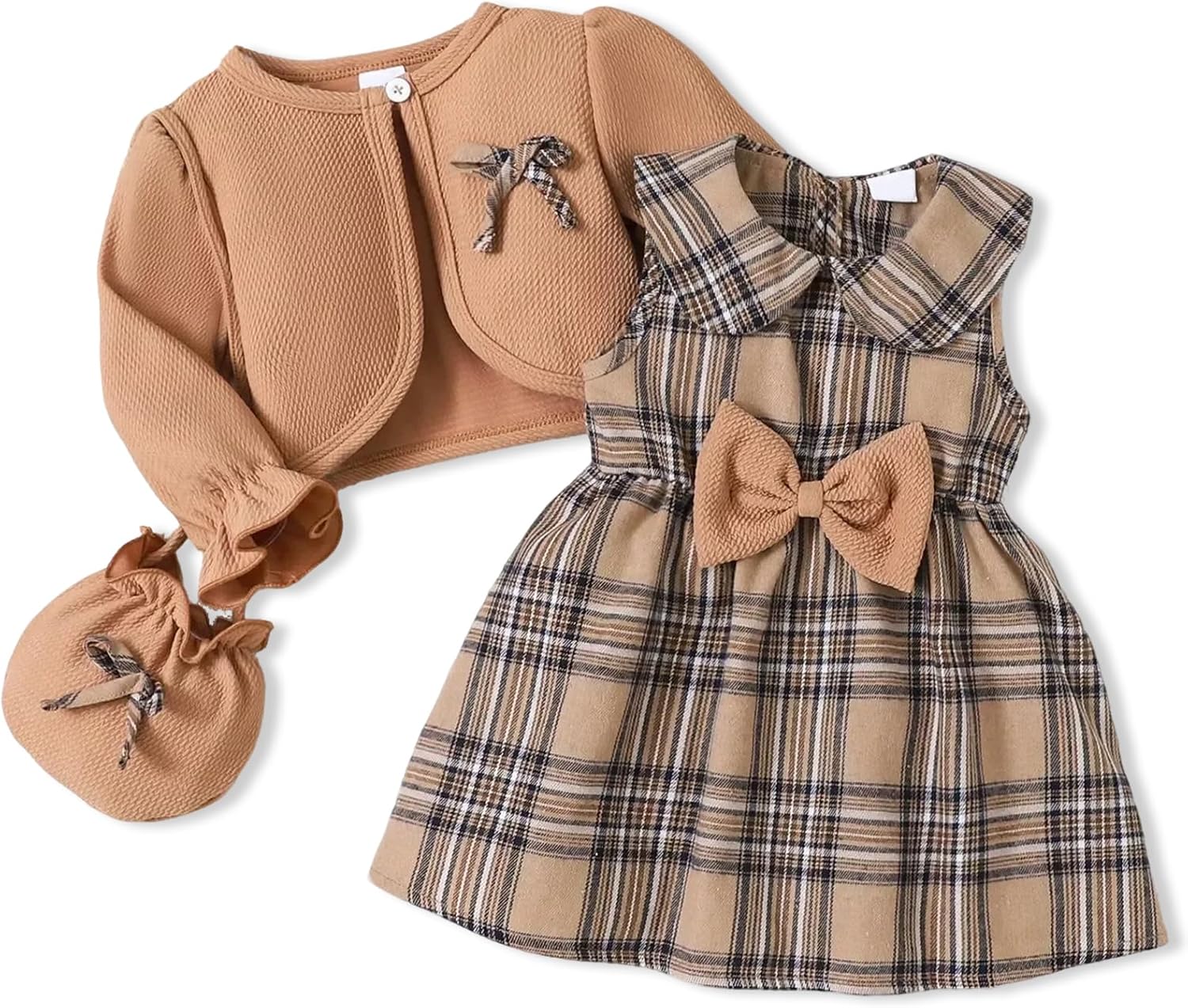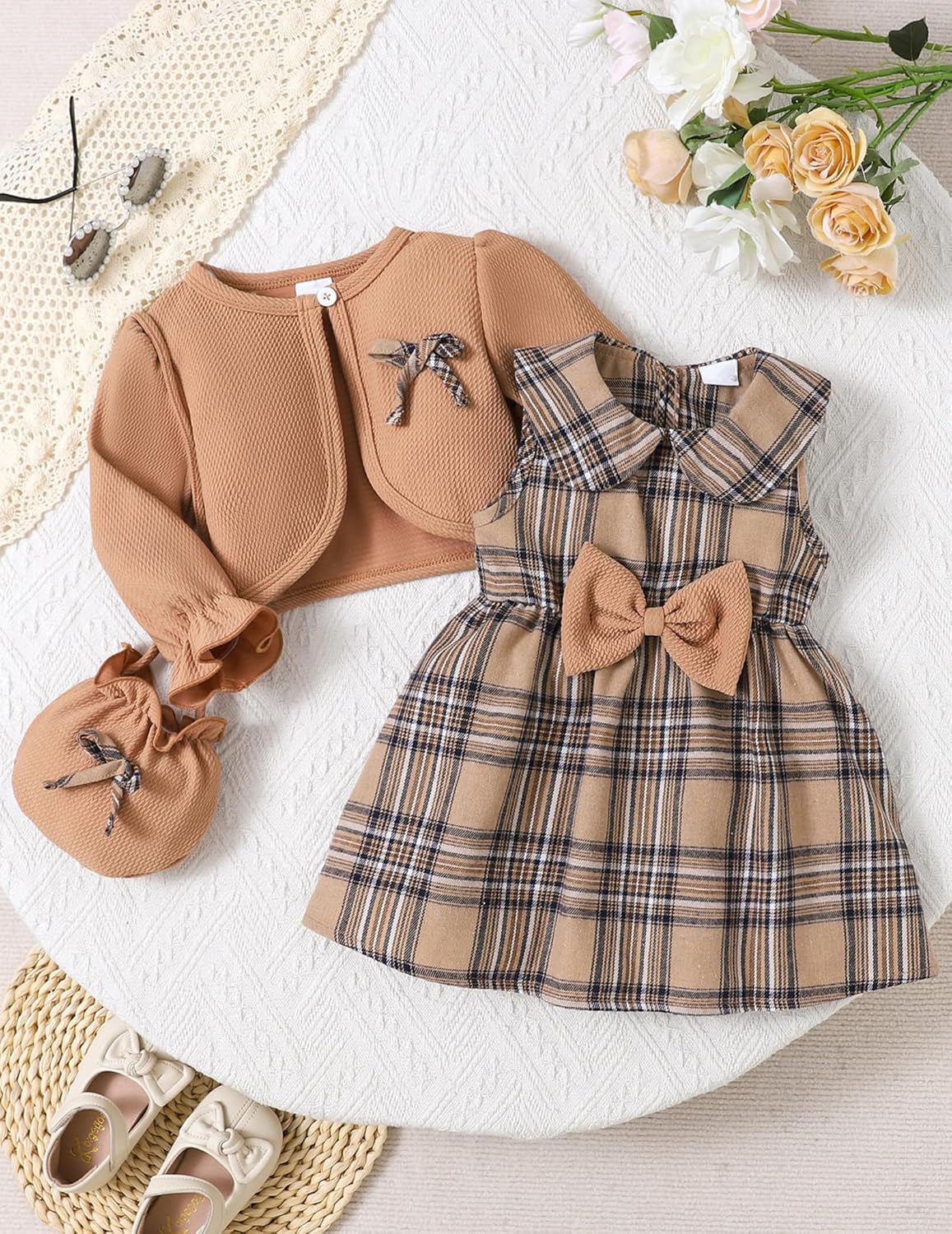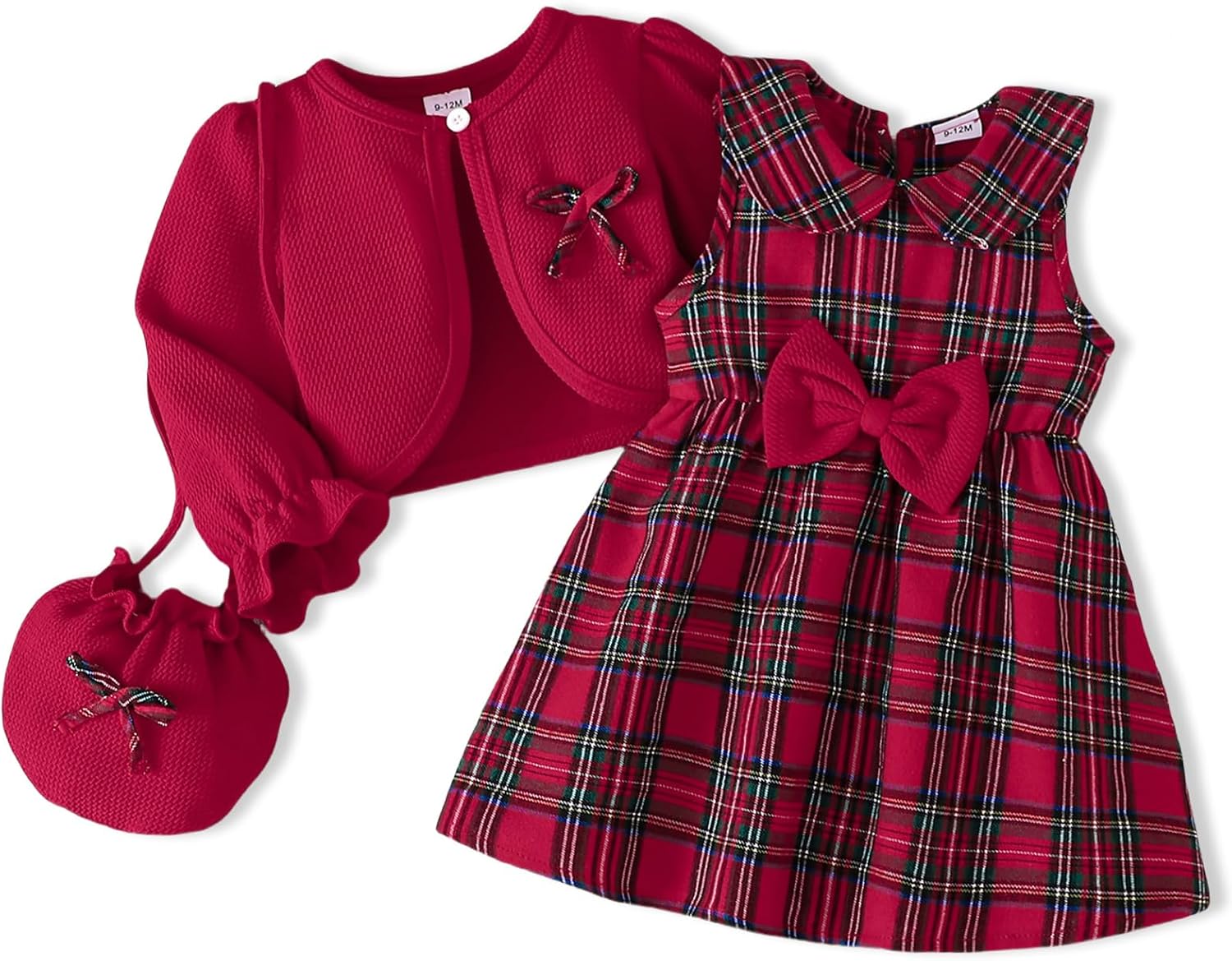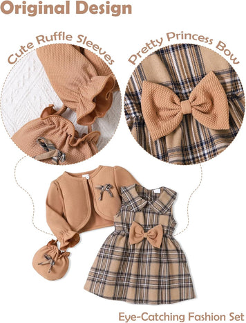 • Creative Prints: This dress and cardigan set comes in a variety of eye-catching designs—featuring, flower, butterflies,Classic grid,Cute bow tie,Lovely collar,Elegant shoulder jacket coat and Back-to-school themes dress set matching a adoraable 3D flower bag which is graet for Halloween, Thanksgiving, Christmas outfits dress and gift for baby toddler princess. A lovely fall outfit for girls aged 6 months to 4 years.