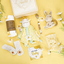 included components Custom wooden box, rabbit rattles, cow doll, gauze blanket, butterfly headband, floral socks, wooden pacifier chain, custom greeting card