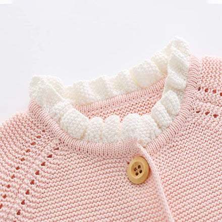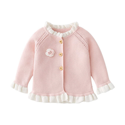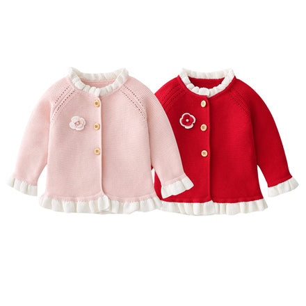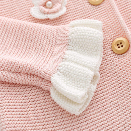 • Classic round neckline, cutest Ruffle design on cuffs and hem, hand-crocheted flowers decoration, Button closure makes the sweater coat easier for baby to wear.