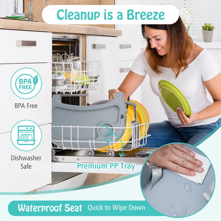 • 【Easy to Assemble & Clean】 Coming with detailed instruction, this baby high chair is quick to assemble. It is easy to wipe clean with smooth surfaces from top to bottom. And the tray is dishwasher safe for daily cleanup after use.