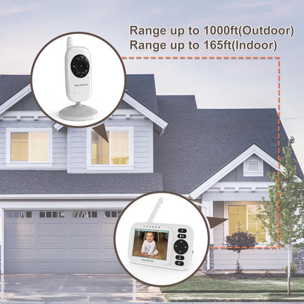 • 【1000ft Long Range & plug and play】Our baby monitors have an indoor monitoring distance of 1000ft and an outdoor monitoring distance of 165ft. No matter where you are in your home, you can monitor your baby anytime and anywhere with our baby monitor. The camera and screen are automatically matched, and ready to use when plugged in.