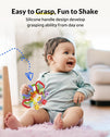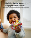 • Dual Function: Teething Relief & Rattle Fun – This baby toy combines teething points and rattle sounds to soothe your baby’s sore gums while keeping them entertained. Perfect for babies 0-12 months, it promotes both sensory development and comfort during teething