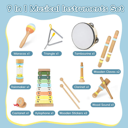 • Wooden kids drum set of 9: These adorable baby musical toys are arranged in warm and welcoming colors and include an 8-tone xylophone with mallets, a tambourine with cymbals, a maraca, a trumpet, a triangle with striker, a clarinet, a rainmaker, a castanet, and a wood sounder. Every melody played sounds as harmonious as it is pleasant, the perfect introduction for baby musical learners!