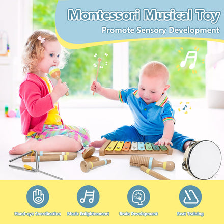 • Early educational musical toys: The wooden musical instrument set is great for toddlers 1-3, perfect for the musical awakening by exploring sounds and creative free expression. Designed for interactive learning, rhythm recognition, and social development. It helps enhance hand-eye coordination and boost concentration skills.