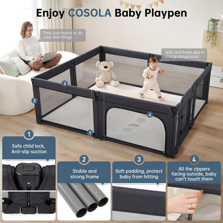 • [Safety First]: Designed with safety in mind, our baby playpen features high-density sponge padding around the top and non-slip suction cups at the base, keeping your playpen securely in place and reducing the risk of bumps,your baby is safe in such a sturdy playpen.