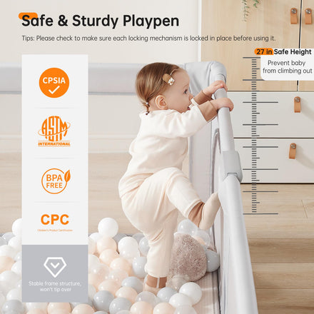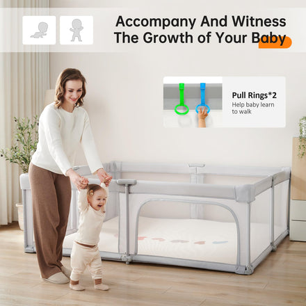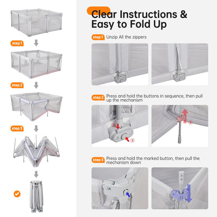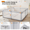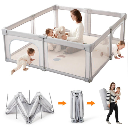 • 【🌄 Stylish & Unique Design】Measuring 59" x 59", this folding baby play pen offers a spacious and safe area for babies and toddlers. Crafted from light grey 300D Oxford cloth and a sleek rectangular frame, it combines beauty and functionality. This modern baby fence complements any home decor while adding a refreshing touch of style.