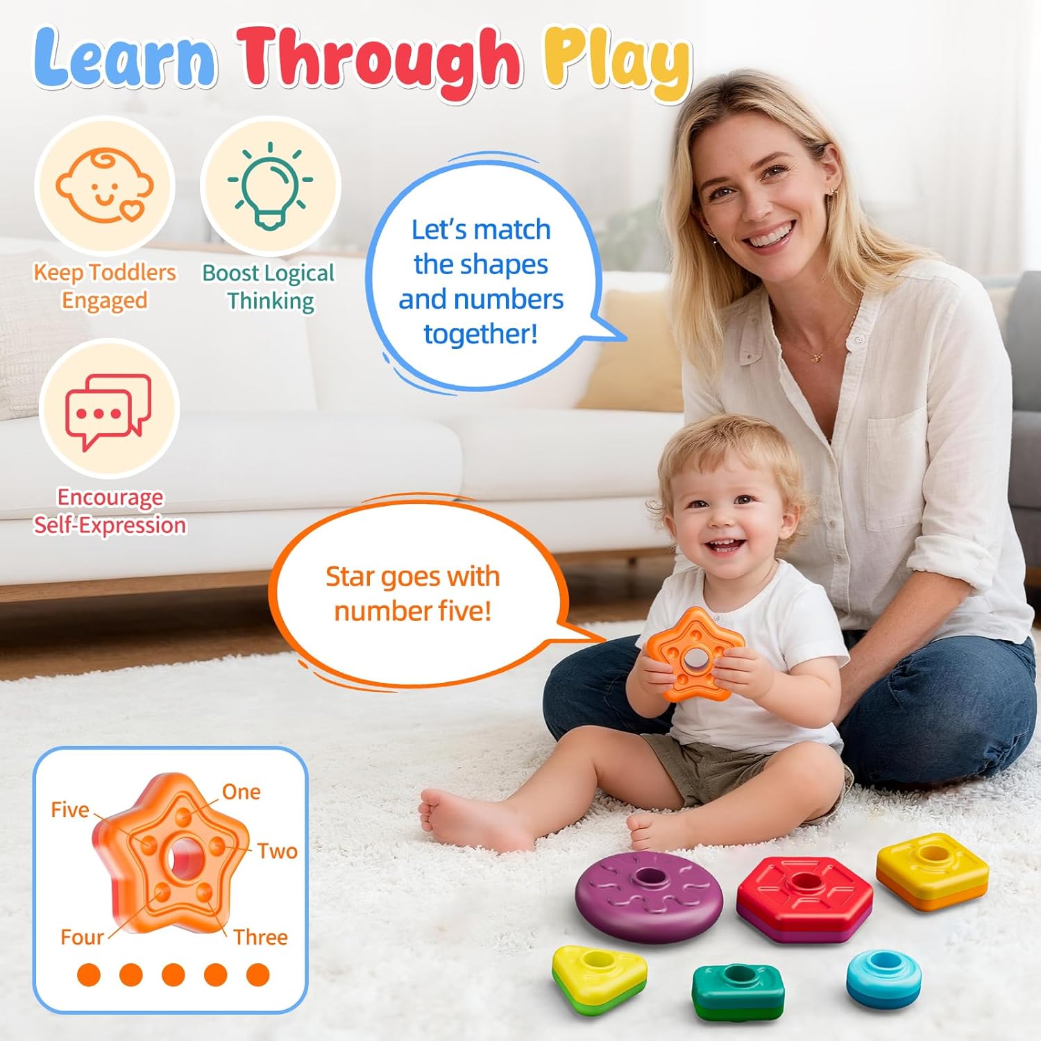 • Boost Interaction with Sound Numbers: Sensory montessori toys for toddlers: advanced match colorful rings with rattle beads for sound-sight connection. Fun number game (1–6) builds counting skills easier and early math sense through playful learning