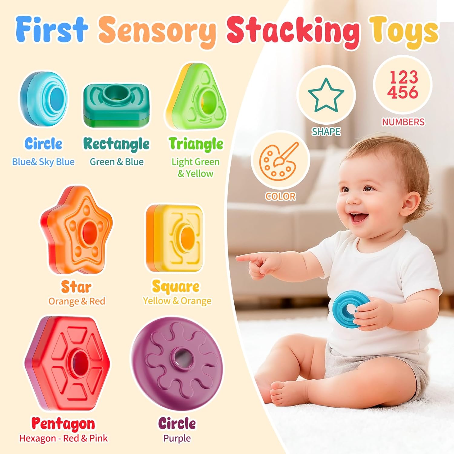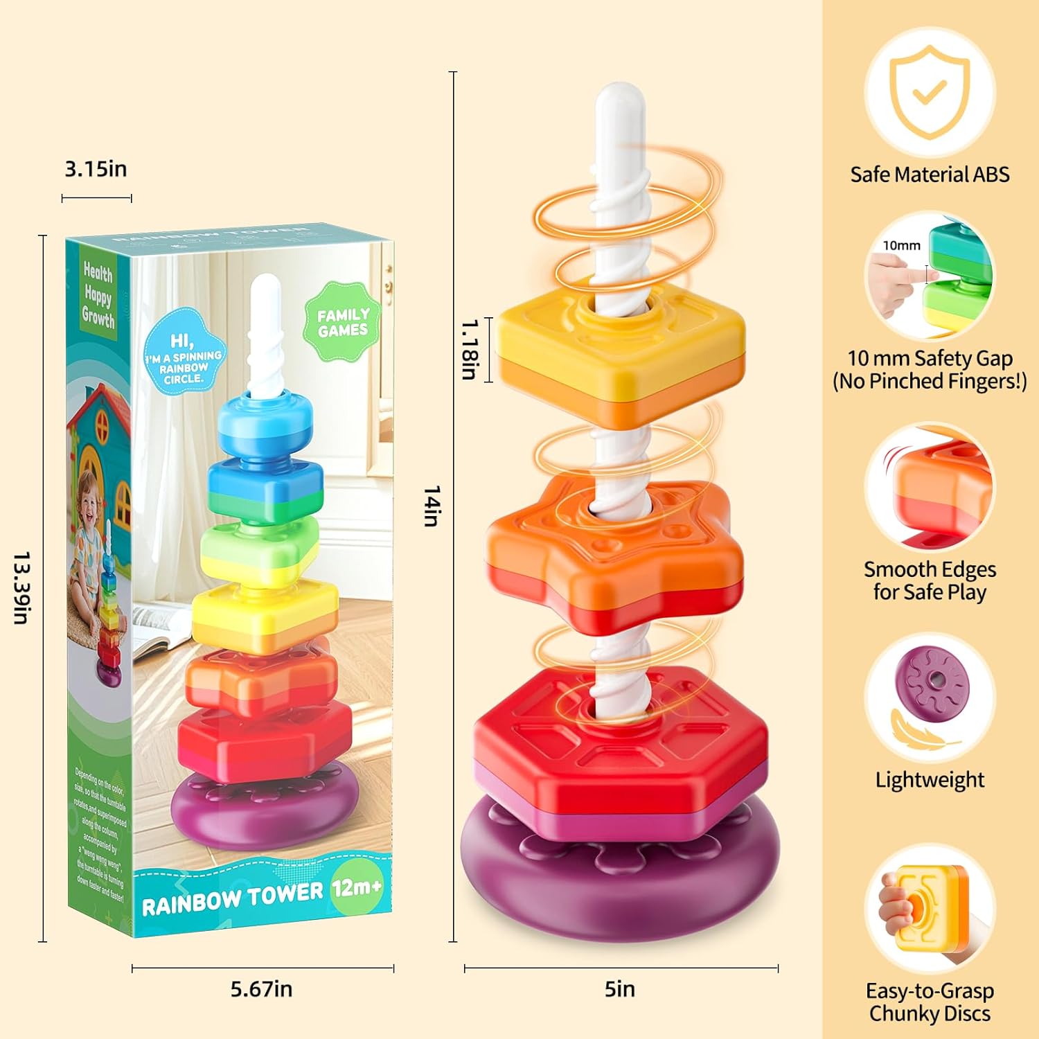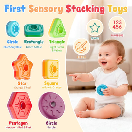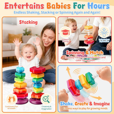 • Educational Learning Toys: More than just a baby toy! Kids explore spinning stacker toy by color, size, sequencing or shape, enjoying rich textures and spinning motion. Builds color recognition, hand-eye coordination, fine motor skills, and cause-and-effect understanding through play