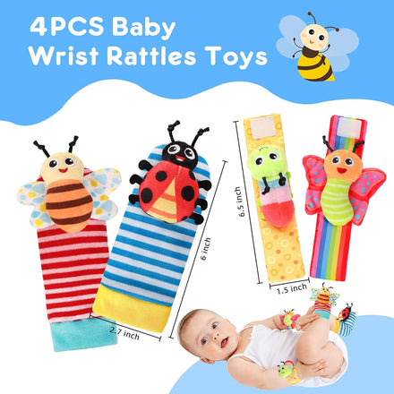 • THE IDEAL BABY GIFT - This elegant gift set includes two soft wrist rattles and two foot finders,which are suitable as a baby shower gift or newborn congratulatory gift, new families are sure to appreciate these soft infant toys for their bundle of joy.