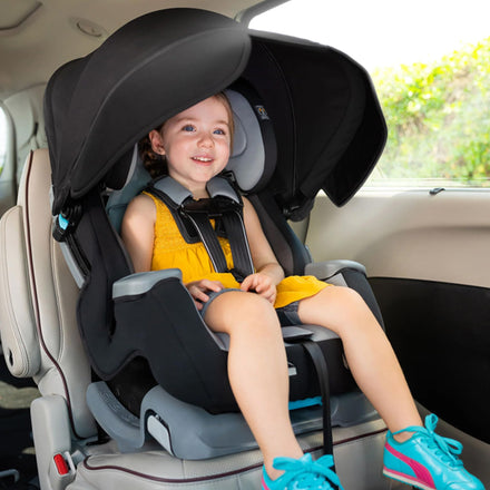 • Maximum Safety: Innovative height and angle adjustable canopy for complete in-car shade protection; Flip-out side visors for additional protection; Built-in track allows for easy adjustability and removal