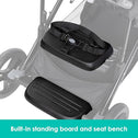• The stroller frame includes a built-in standing board and seat bench, allowing two children to ride at the same time