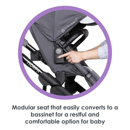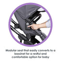 • Includes a modular stroller seat that easily converts to a bassinet for a restful and comfortable option for baby