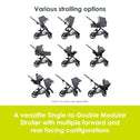• A versatile Single-to-Double Modular Stroller with multiple Forward and Rear facing configurations for a personalized strolling experience!