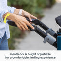 • The footrest on the stroller seat adjusts for your growing child to ensure extended use