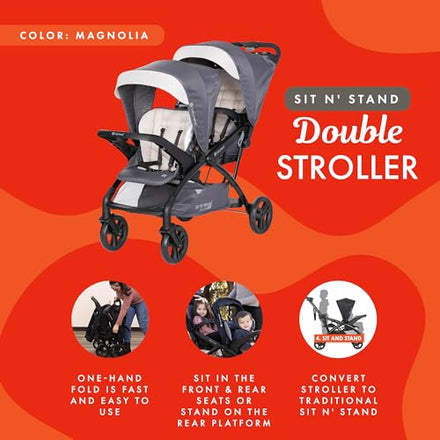 Baby Trend Sit N' Stand Tandem Double Stroller 2.0 DLX with 5 Point Safety Harness, Shaded Canopy, 2 Cup Holders, and Ample Storage Space, Magnolia