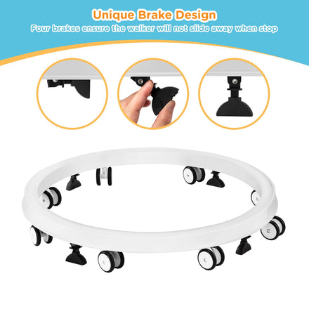 • 【360° Wheels & Safety Brake】 The 360° swivel wheels let your baby explore their surroundings effortlessly. In addition, simply lock the brakes to convert the walkers for babies 6-12 months into a fixed activity center. Universal wheels provide fun entertainment for babies, brakes provide a safer eating environment, and they making it easier for parents to take care of your baby