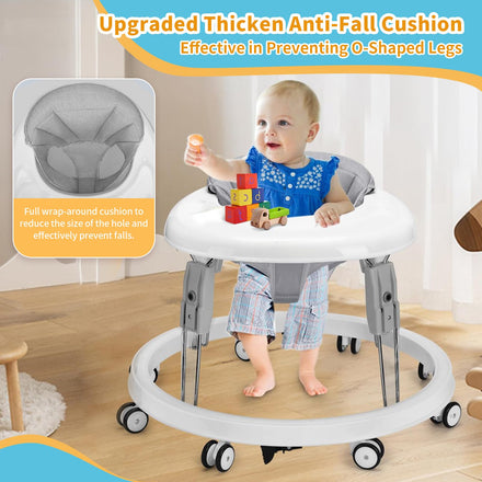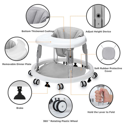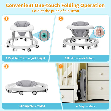 Baby Walker with Wheels, One-Touch Folding Portable Baby Walkers with Height Adjustment, Large Dinner Plate and Brake, Walker for Baby Boy Girls 6-18 Months, Gray