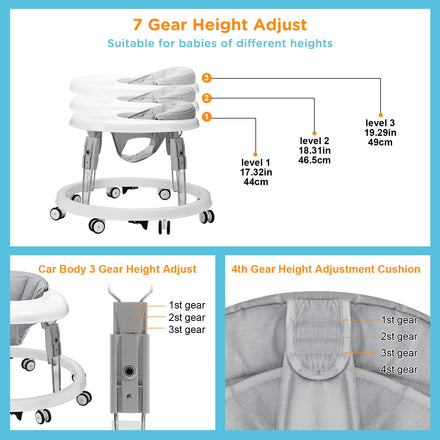 • 【Height Adjustable 】The one-touch button design makes height adjustment effortless – simply press the button on the frame to modify the height. In addition to the 3 adjustable levels on the frame, the baby walker's seat also features 4 height settings, accommodating children of different ages and heights as they grow, while effectively helping prevent bow legs