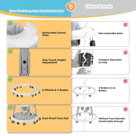 • 【Removable Dinner Plate】Our baby walkers comes with a detachable dining plate. Does not contain BPA, PVC, or phthalates phthalates and can be directly used for baby dining.The dining plate is not only easy to wipe and clean, but also safe and space saving, making it convenient for daily use and storage