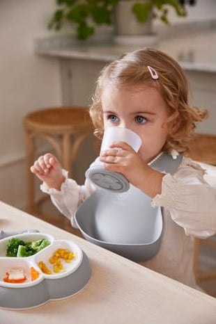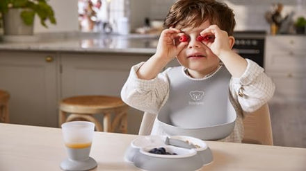 Details: All kitchen products from BabyBjörn have been designed to suit very young children. The trefoil shape of the plate is not only cute but also makes scooping up food easier. The spoon and fork are shaped to not slide down into the plate, and their short handles are easy to grip. The cup is stable and easy to hold, and its contents can be seen through the frosted plastic. The soft neckband of the bib is adjustable, and the generous spill pocket effectively catches food and mess. It’s simply the perfect starter kit for children who want to start self-feeding.