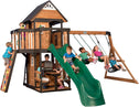 Backyard Discovery Canyon Creek Cedar Wood Swing Set with Wave Slide, Clubhouse, Play Kitchen, Picnic Area, Belt Swings, Web Swing, Rock Wall, Balconies, Playhouse, Step Ladder, Outdoor Playset