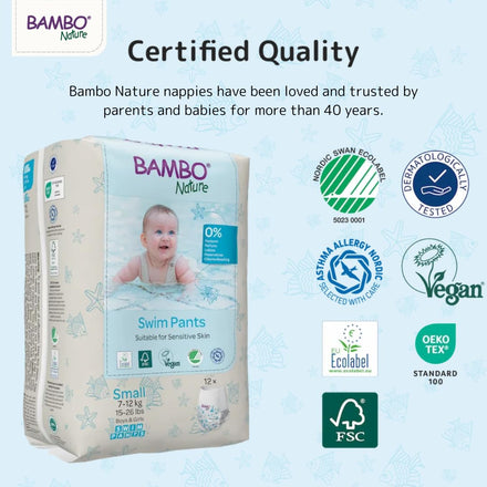 Details: Bambo Nature disposable Swim Pants have a soft, elastic fit all-around the waist, giving your baby a super comfortable and flexible experience in the water. Designed for use in water with double leak barriers to keep the water clean and safe from messy accidents. The Swim Pants are dermatologically tested and certified according to the Nordic Swan Ecolabel, the EU Ecolabel, Asthma Allergy Nordic, the FSC™ (Forest Stewardship Council) and OEKO-TEX Standard 100.