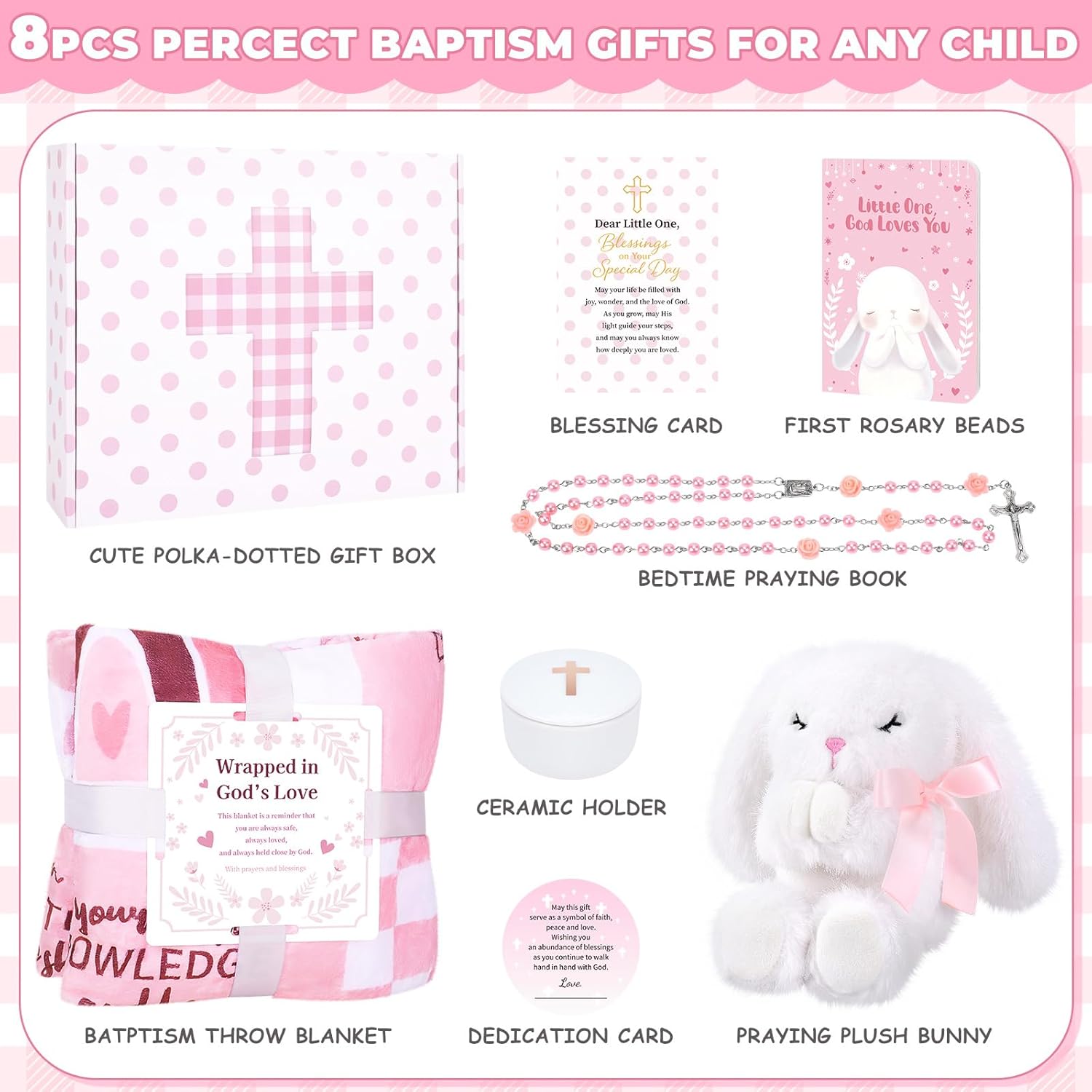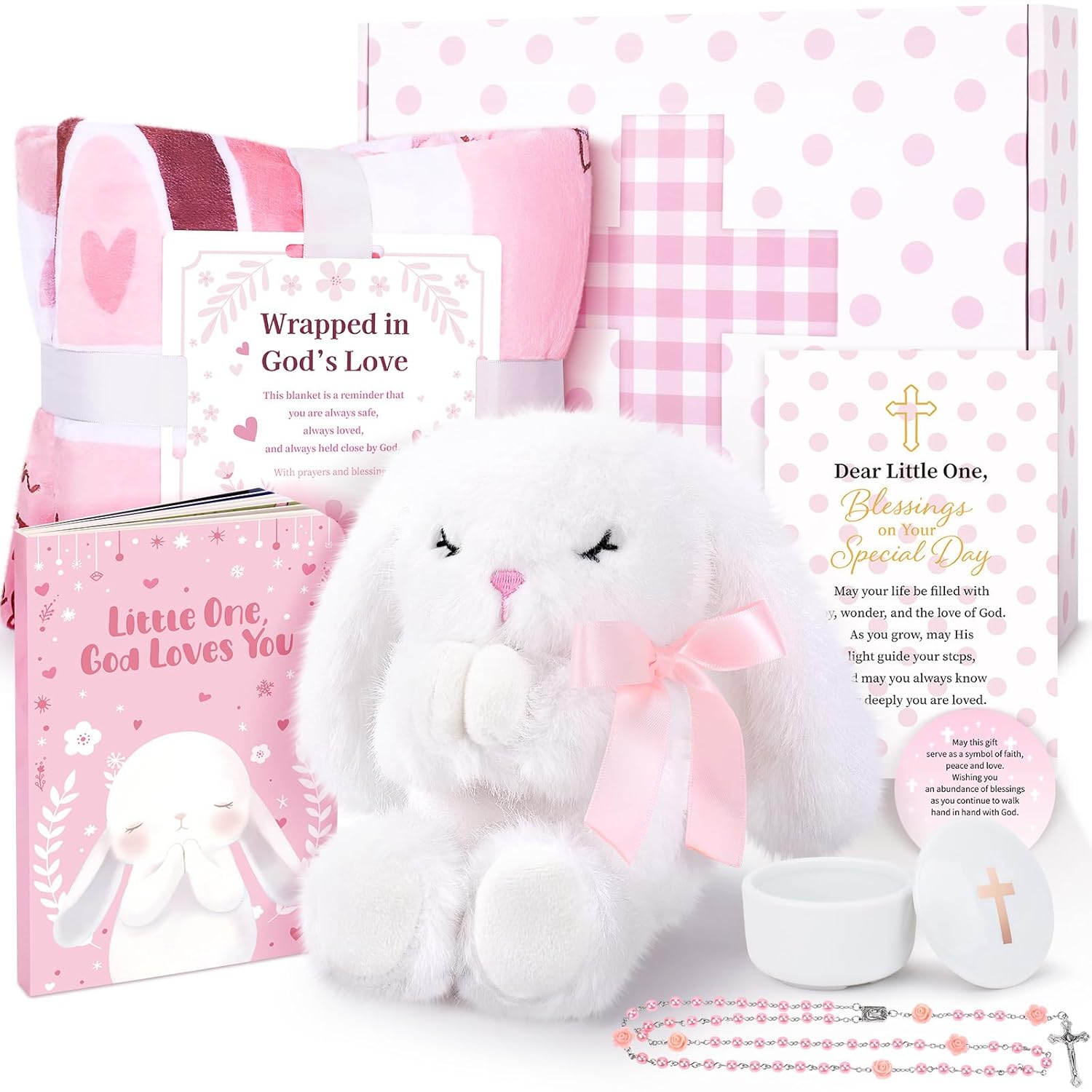 • A Beautiful & Complete Baptism Gifts for Girls: Honor her blessed day with a gorgeous, all-in-one baptism gift basket. This thoughtfully curated set is a perfect present, containing a bunny stuffed animal, a blessed blanket, first rosary beads in a ceramic holder, and a prayer storybook. It’s an unforgettable dedication or christening gift for a baby girl.