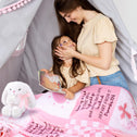 A soft, elegant christening blanket perfect for wrapping your little girl in love. This blanket is an essential part of the baby girl baptism gifts. Our cuddly Plush Bunny Stuffed Animal is a gentle friend. The perfect companion for a newborn baby to cherish for years. The pink first rosary beads are a beautiful Catholic baptism gift. This set includes a ceramic jar to protect the treasured keepsake. All items are perfectly arranged inside, saving you time and effort. The ideal christening gift set and baptism gift basket for a newborn.