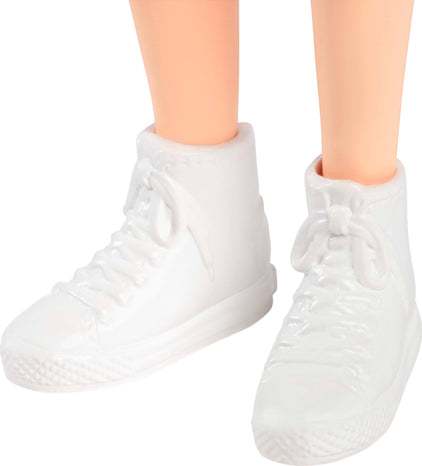 • This petite Barbie doll wears her red hair in a bouncy side pony! Her look features fun details that make her personality pop, like a pink watch and white sneakers.