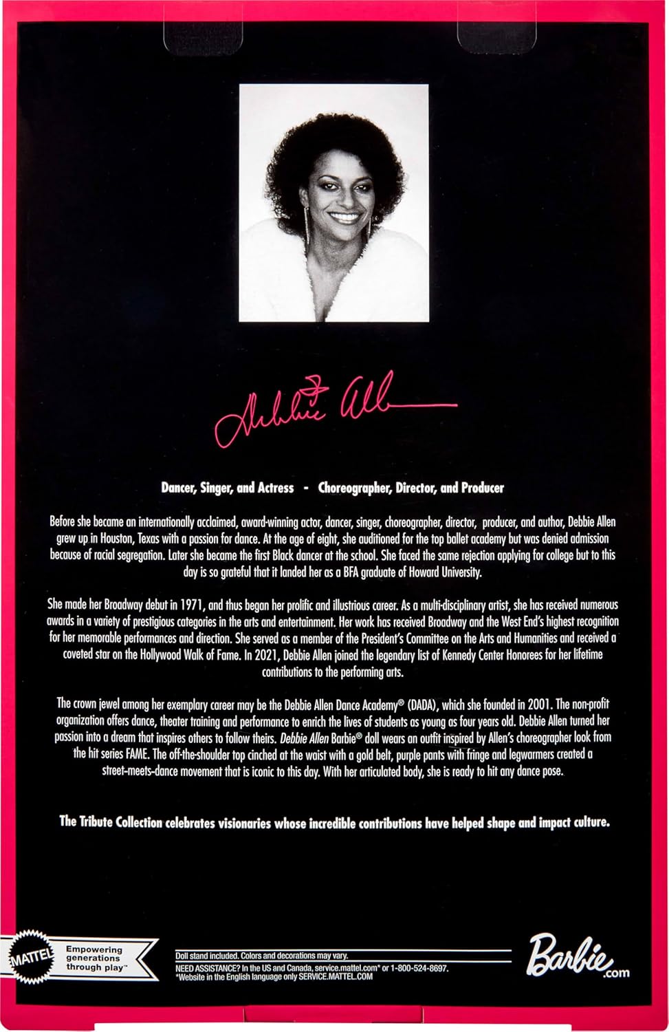The Barbie Tribute Collection celebrates visionaries whose incredible contributions have helped shape and impact culture. This collectible Barbie doll honors Debbie Allen, an award-winning actor, dancer, singer, choreographer, director, producer, and author who rose to stardom despite facing many barriers. Her doll wears an eye-catching outfit inspired by a look from the celebrated television series FAME -- a fitting tribute to Debbie Allen’s remarkable legacy. Doll stand and Certificate of Authenticity included. Doll cannot stand alone. Colors and decorations may vary.