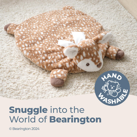 • LIL’ WILLOW PLUSH BLANKET: The Bearington Lil’ Willow Tummy Time Blanket is the perfect baby play mat for your little one. This baby tummy time play mat is an adorable addition to any woodland nursery. This deer baby blanket with velour lining not only provides a soft and cozy surface for your baby's playtime but also adds a touch of whimsical charm to your woodland theme nursery decor.
