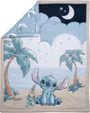 • Features Disney's Stitch and Scrump chilling out between palm trees under a crescent moon, stars, and clouds