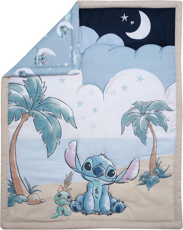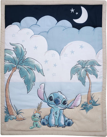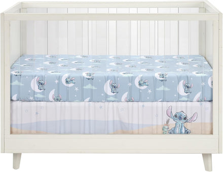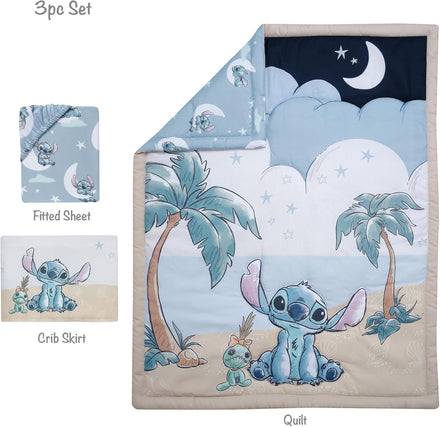 This three-piece soft microfiber crib bedding set featuring Disney's Stitch and his pal Scrump, invites your little one to catch some waves of cuteness. The set comes complete with one quilt, one fitted crib sheet, and one crib skirt. The quilt features Stitch and Scrump chilling between swaying palm trees, under a crescent moon, twinkling stars, and soft clouds. The fitted crib sheet is on a celestial blue ground with Stitch in various poses on white crescent moons, surrounded by white stars and floating clouds. There is elastic all the way around ensuring a safe and secure fit on a standard size crib mattress. The crib skirt adds the finishing touch to your child’s crib. It features Stitch on the beach sitting side by side with his best pal Scrump.