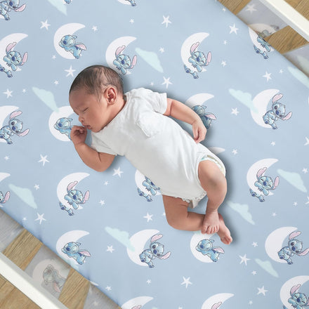 • Fitted crib sheet shows Stitch in super cute poses on crescent moons surrounded by stars and clouds