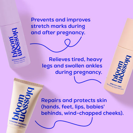 • Essential Set Includes: Three pregnancy skincare essentials – 40ml Revitalizing Leg Spray for tired legs, 25ml Multi-Purpose Balm for dry areas, and 40ml Stretch Mark Oil to maintain skin elasticity.