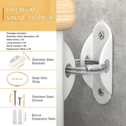• MULTI-USE ON VARIOUS FURNITURE: 10 pack baby proof furniture anchors include all hardware including screws, steel wire straps, brackets, expansion nails. It is widely used to wall secure anchor for furniture such as bookshelf, bookcase, cabinet, drawer, dresser, TV stand, armoires, wardrobes, and any baby furniture. Ensure all the heavy and tall furniture around your home can be anchored tightly for a child-safe environment
