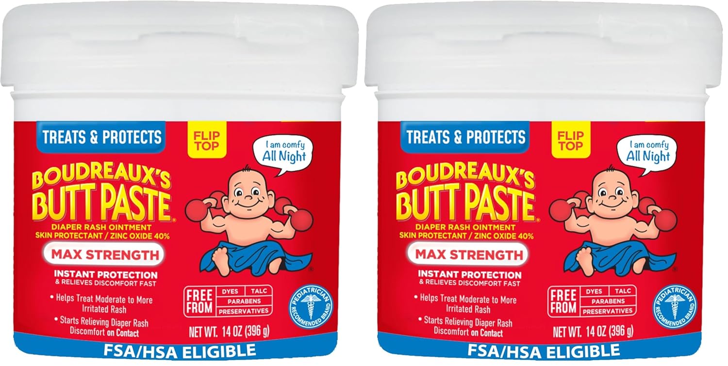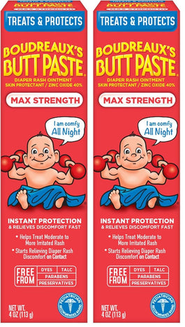 Developed by a pharmacist and father of four, Boudreaux's Butt Paste Brand has been trusted for over 40 years by pediatricians and parents to help protect irritated skin due to diaper rash and to instantly seal out wetness. When used daily, it is also a great way to help prevent diaper rash. Boudreaux's Butt Paste Maximum is a thick, cream-like protective diaper rash ointment with 40% Zinc Oxide. It provides overnight protection, starts to soothe on contact, seals out moisture and helps keep baby’s boo-tay dry. Boudreaux's Butt Paste Maximum Strength is free from dyes, preservatives, parabens and talc. Don't forget to keep your baby’s butt protected and your hands mess free with our diaper rash cream and ointment brush applicator. Boudreaux’s Butt Paste has diaper ointments for any baby’s boo-tay needs including maximum strength, sensitive, natural* aloe, and butt barrier. Boudreaux's Butt Paste products are FSA- and HSA-eligible in the US. *Other ingredients may not be natural. Natural refers to the source of listed ingredients and allows for only minimal, non-chemical processing of these ingredients.