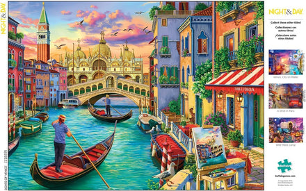 This 1000-piece jigsaw puzzle titled Sights Of Venice is from the Night & Day Series by Buffalo Games. This image showcases the floating city. Boats travel down the famous canals as lights shine through the windows of the classic buildings in this relaxing scene. The Night & Day Series captures the energetic ebb and flow from dawn 'til dark of different well-known landmarks around the world. Every Buffalo Games jigsaw puzzle is manufactured from recycled puzzle board. A precision cutting technique guarantees that every piece will fit soundly with the company's signature Perfect Snap™. A bonus puzzle poster is also included so that you have a handy reference of what the completed puzzle should look like while you put yours together.