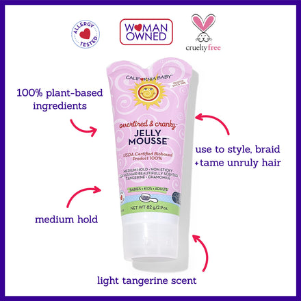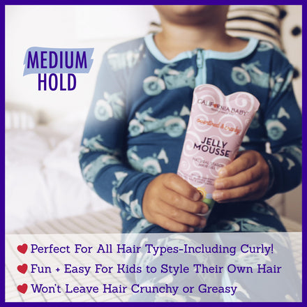 • SAFE, 100% PLANT-BASED KIDS HAIR GEL: No harsh chemicals - California Baby Jelly Mousse is an infant safe hair gel, made with 100% plant-based ingredients. Our baby hair gel for infants is free of harsh, drying chemicals like alcohol, PEGs, and glycols.