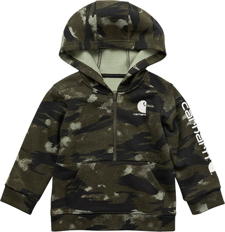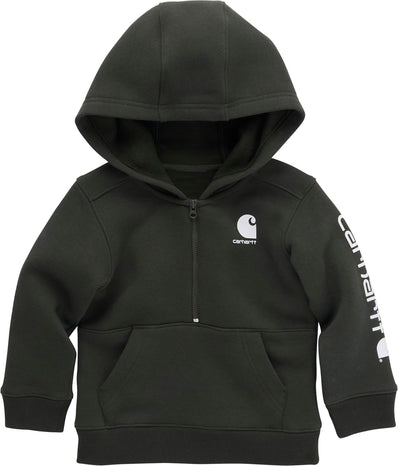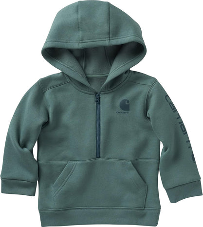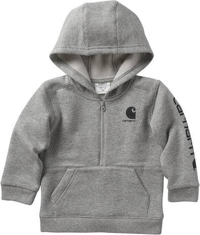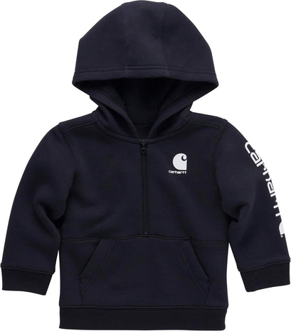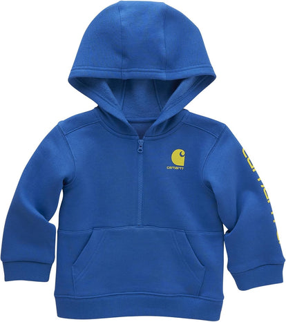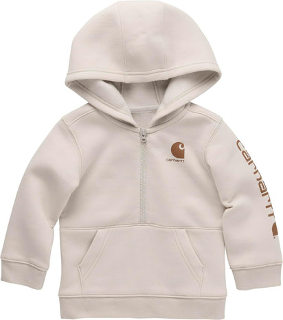 Made for the little guy with big energy, the Carhartt Baby & Toddler Half-Zip Hooded Sweatshirt keeps him warm, comfy, and looking cool wherever the day takes him. Whether he’s learning to walk, running with older siblings, or just napping in the stroller, this zip hoodie is built for comfort and durability. Constructed from heavyweight 9-ounce fleece (80% cotton, 20% polyester), it provides cozy insulation without being too bulky. The half-zip closure makes it easy to slip on over tees or bodysuits, and the roomy kangaroo pocket gives little hands a warm place to rest—or stash a favorite toy. Ribbed cuffs and hem help keep the cold out and the fit snug. With bold Carhartt branding on the chest and sleeve, this pullover zip hoodie brings workwear-inspired style to toddler wear. Whether it’s for daycare, preschool, family photos, or playdates at the park, this fleece sweatshirt is a reliable, machine-washable favorite for busy parents and growing boys.