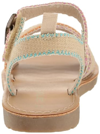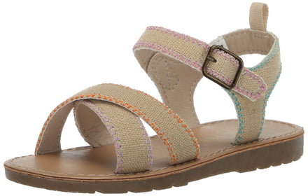Featuring a convenient hook-and-loop closure in the back, Connie makes slipping into these sandals a breeze. But the real showstopper is the front, where a delightful array of crisscross straps awaits. Each strap is adorned with rainbow stitching, creating a mesmerizing burst of color that will make her every step feel like walking on sunshine.