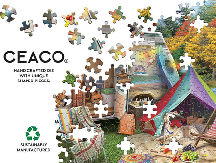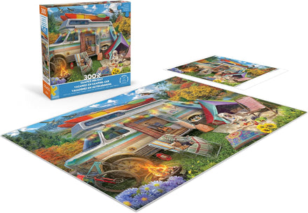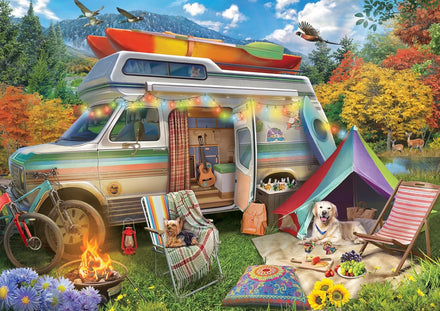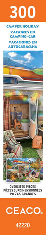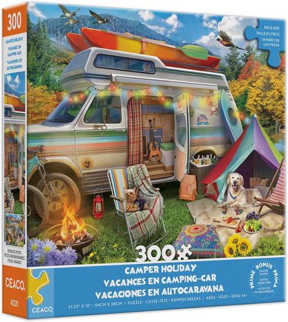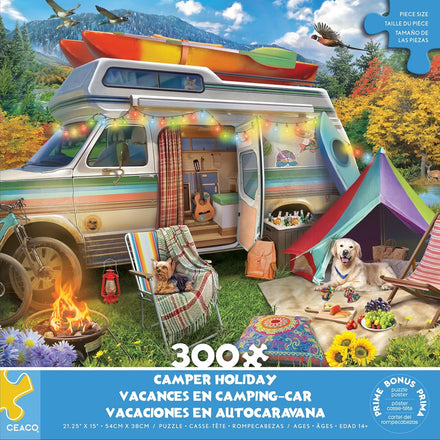 This 300 oversized piece 24 x 18-inch interlocking jigsaw puzzle for ages 14+ is by Eduard and is titled "Camper Holiday". It features a camper van parked in a beautiful spot in the mountains, with a tent, chairs and a fire pit with a roaring fire set up in front of it. A golden retriever and a Yorkshire terrier are relaxing at the campsite. A bonus poster is included with the puzzle. Count on Ceaco for the most Creative, Exciting, and Colorful puzzles since 1987.