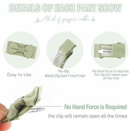 • 【Mini Bows for Baby Girls】Perfect dainty bow Clip measures 1.25" approx. (Size: Baby's baby finger)Clip the Light weight bow that baby even do not realize there is it.Great for little wisps of baby hair or clip bangs without covering your baby's face, even doing ponytail or pigtails.