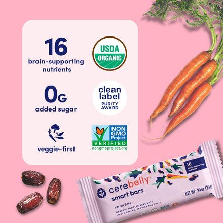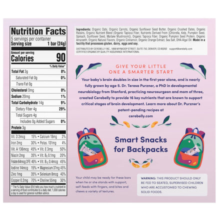 Cerebelly Toddler Snack Bars – Organic Carrot Date Smart Bars (Pack of 5), Healthy & Organic Whole Grain Bars with Veggies & Fruit, 16 Brain-supporting Nutrients from Superfoods, No Added Sugar