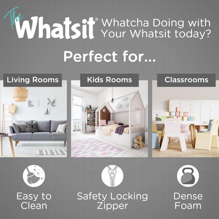 Details: The Whatsit is part couch or two chairs - part play set. It features a 6-piece design with 2 back rests, 2 bottom pieces, and 2 top pieces. Bottom pieces feature dense foam to ensure the sofa will endure wear and tear. Top pieces have softer foam so toddlers, kids, and teens are able to snuggle into their new couch. Material is velvet-soft, high-performance, stain-repellant and is easy to clean. Cover zip on and off in seconds and are machine washable.