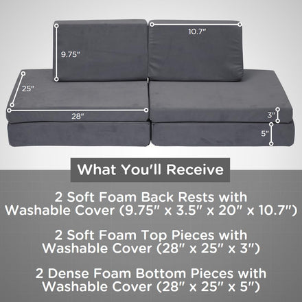 - 6-PIECE DESIGN: Sofa has 2 back rests, 2 bottom pieces, & 2 top pieces. Bottom pieces feature dense foam to ensure the sofa will endure wear and tear. Top pieces are made from a softer foam, so kids are able to snuggle into their new couch.