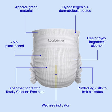 • THE BABY DIAPERS: Minimize leaks, blowouts, and the cause of moisture-related diaper rash. Coterie Diapers can absorb over 16 oz of liquid (based on lab testing of Size 4 Diapers) and provide up to 4x faster absorbency* and up to 3x drier skin* (*compared to leading brands in lab testing). Ultra-soft, apparel-grade materials offer day and night comfort and protection for baby's delicate skin.